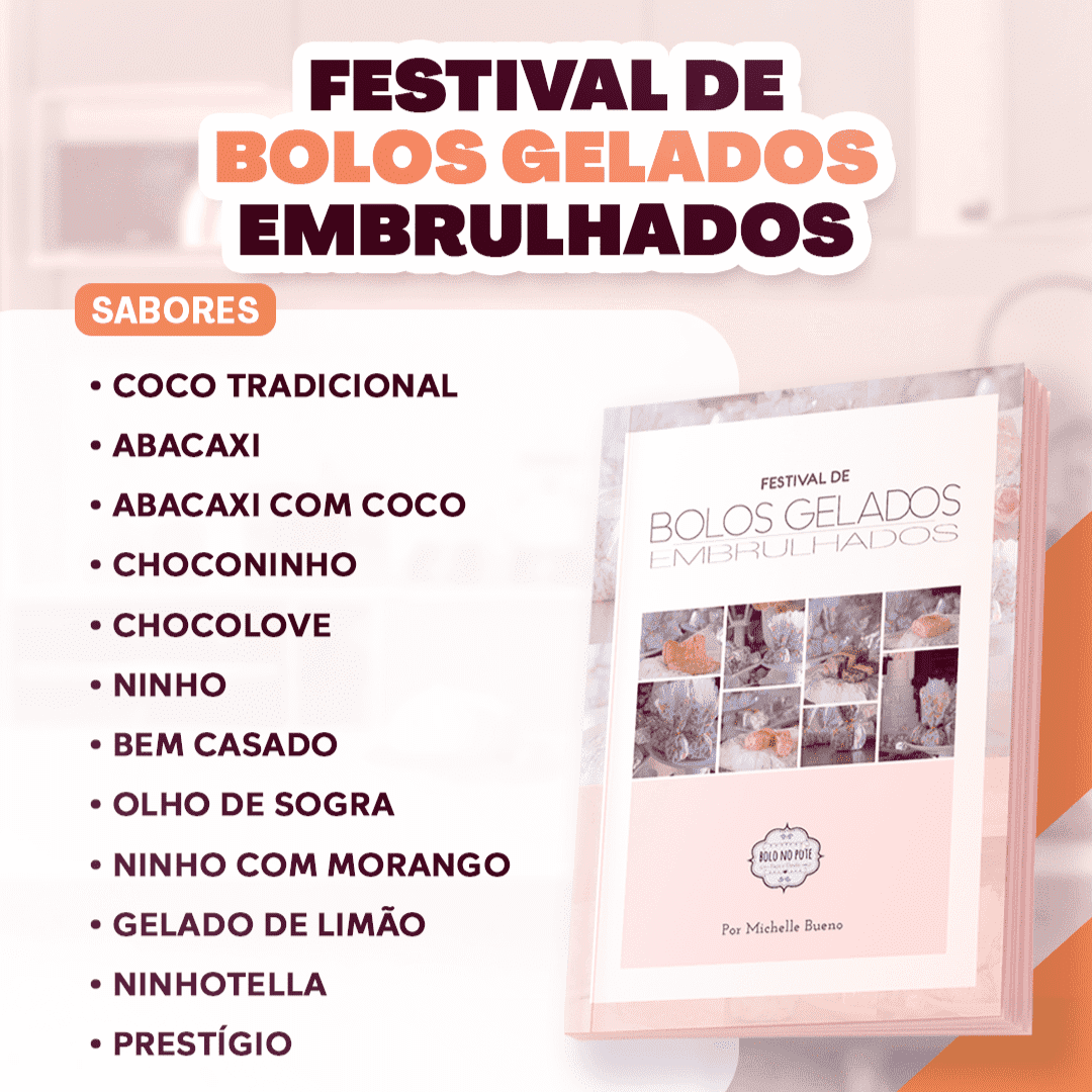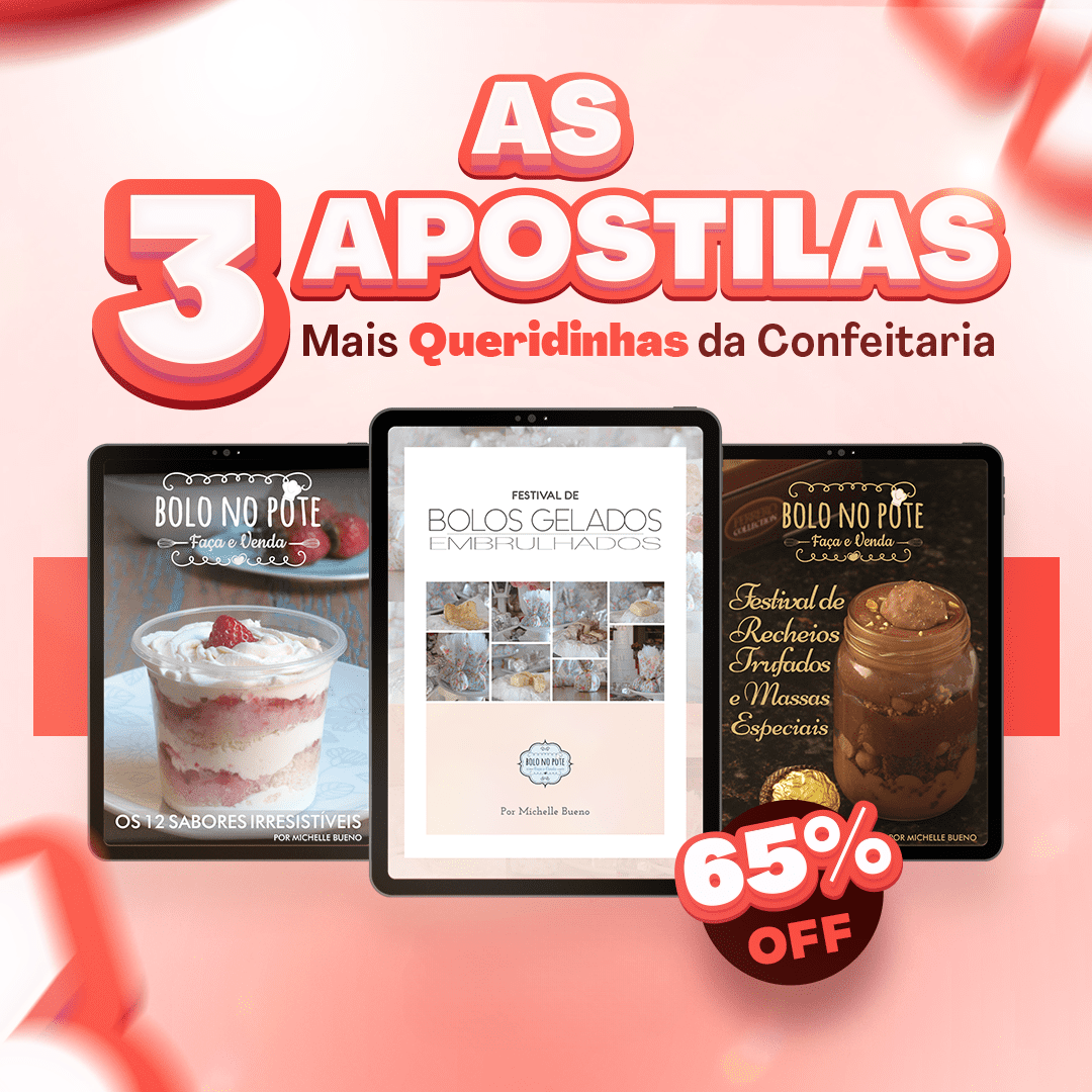 Além dos dois E-books “Festival de Bolos Gelados Embrulhados” e “Festival de Recheios Trufados e Massas Especiais”Você também leva a Apostila de Bolo no Pote com As Melhores Receitas para os Potinhos da Felicidade Irresistíveis para você se diferenciar dos concorrentes e fazer de seus clientes verdadeiros fãs: